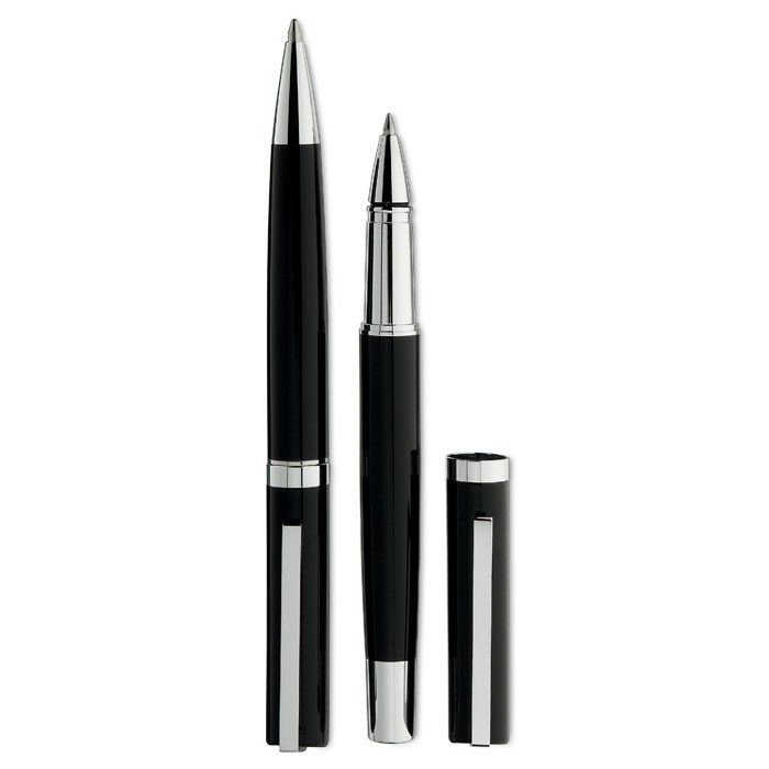 El set corporativo Cecil incluye un elegante bolígrafo giratorio y un roller, presentados en una caja de regalo. Ideal para regalos promocionales de empresa. Fabricados en metal con detalles en negro brillante, aportan sofisticación a cualquier campaña publicitaria. Personalízalos con tu logo mediante grabado láser para un impacto duradero. Perfectos como artículos promocionales en eventos y ferias. Tinta azul de alta calidad. Un regalo corporativo personalizado que destaca por su diseño y funcionalidad.