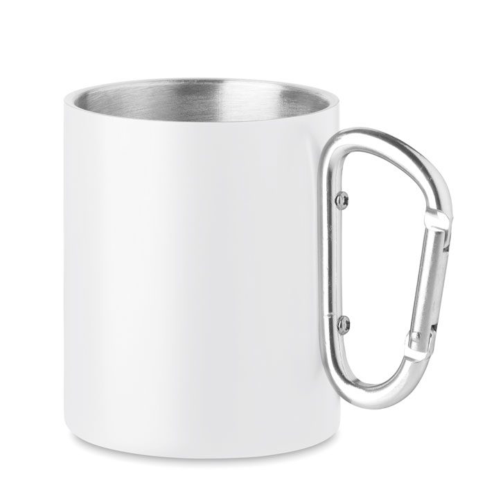 La taza AROM es un artículo promocional corporativo de estilo vintage con esmaltado metálico y doble pared de acero inoxidable, ideal como regalo publicitario en eventos. Su asa de mosquetón la hace perfecta para campañas outdoor. Con capacidad de 300 ml, esta taza personalizada combina funcionalidad y diseño. Perfecta para grabado láser con el logo de tu empresa. Disponible en color blanco, es un regalo corporativo original y práctico.